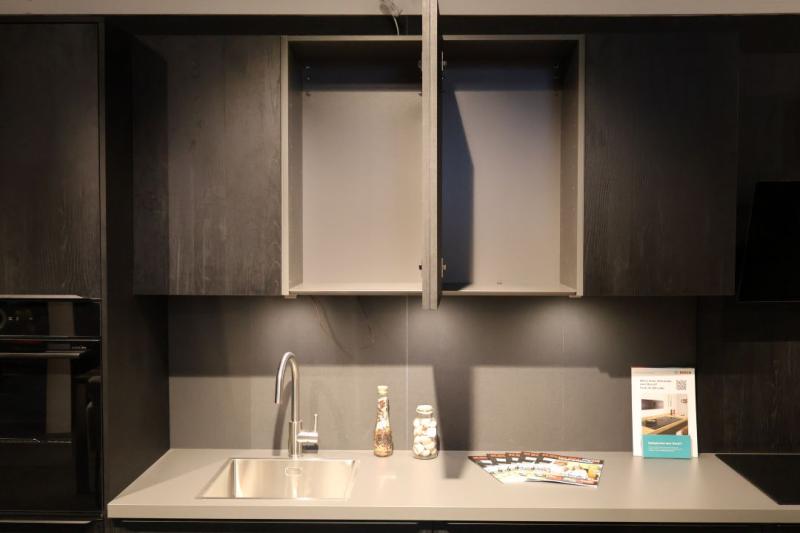 Zwarte houtnerf rechte keuken met o.a. LED-verlichting onder de vouwklepkasten, luxe ladekasten met binnenlade en zwarte greeplijsten.