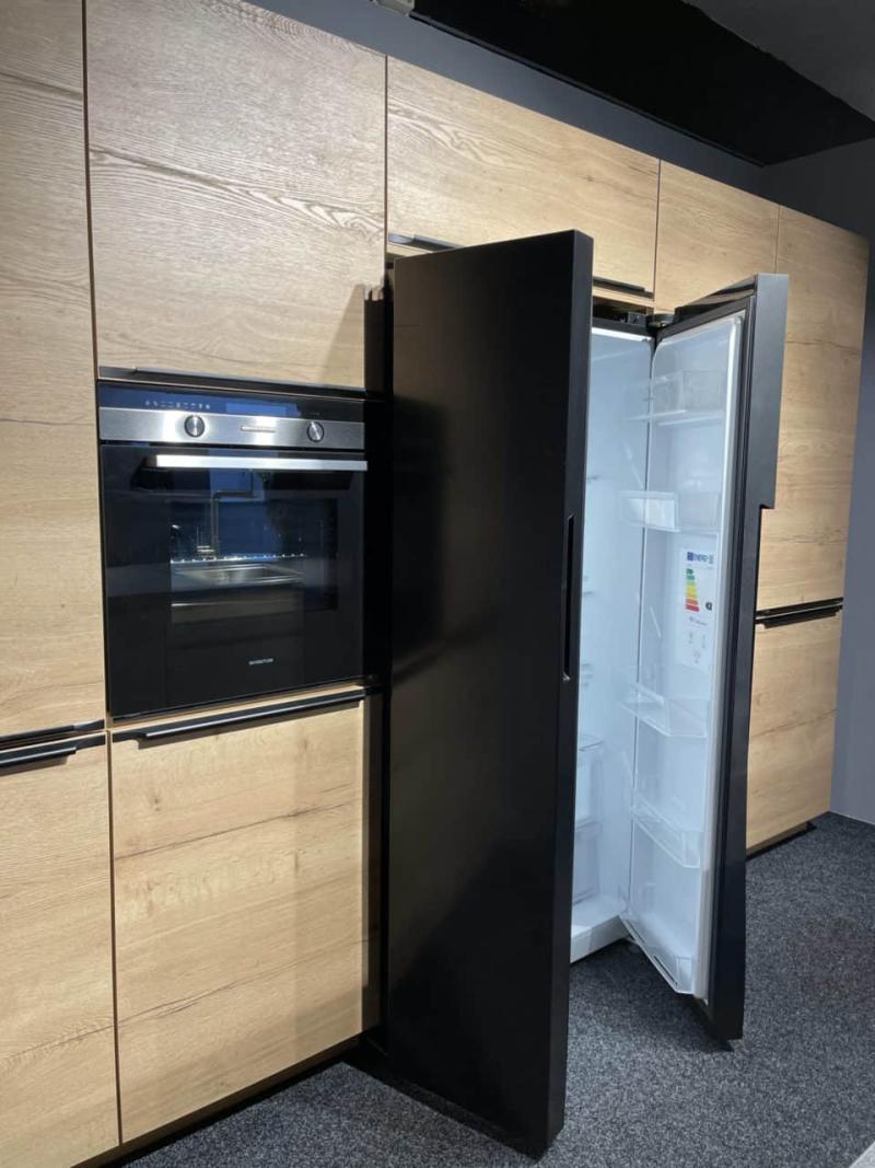 Super compleet met: luxe apparatuur (inductiekookplaat, vaatwasser, Amerikaanse koelkast, oven, combimagnetron), spoelbak, kraan en montagemiddelen.
