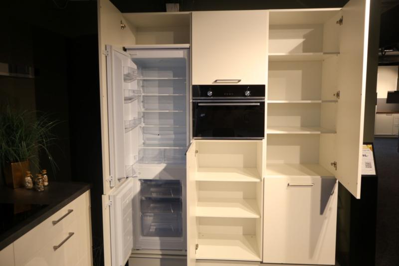 Een hoge wandkast met inbouwapparatuur biedt een strak en overzichtelijk geheel. Apparaten zoals oven, combi en koelkast zijn netjes geïntegreerd op een comfortabele werkhoogte. Dit zorgt voor een moderne uitstraling en extra gebruiksgemak.