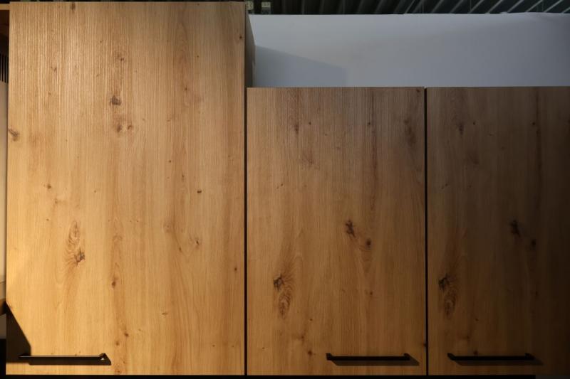 Rechte keuken met stoere houtlook fronten. Inclusief speelse bovenkasten, stoere eiken fronten. Ook leverbaar in 10 andere houttinten. Compacte keuken van alle gemakken voorzien.