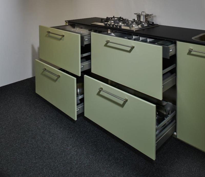 Brede ladekasten met binnenlade bieden extra opbergruimte zonder in te leveren op overzicht. De verborgen binnenlade is ideaal voor bestek of keukentools, terwijl de diepe lade daaronder ruimte biedt voor grotere spullen. Slim, strak en bijzonder functioneel.
