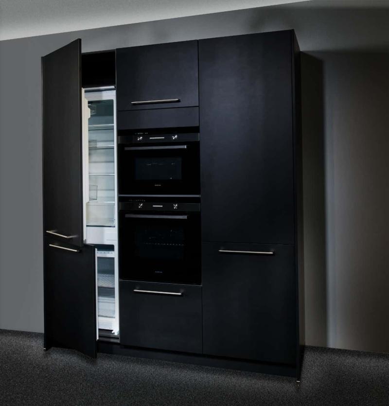 Een hoge wandkast met inbouwapparatuur biedt een strak en overzichtelijk geheel. Apparaten zoals oven, combi en koelkast zijn netjes geïntegreerd op een comfortabele werkhoogte. Dit zorgt voor een moderne uitstraling en extra gebruiksgemak.