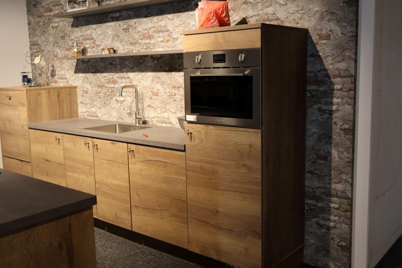 Afmetingen: 340 cm wandzijde, 210 cm lengte eiland. Volledig naar eigen wens aan te passen tegen meer- of minderprijs. In meerdere hout(kleuren) leverbaar.