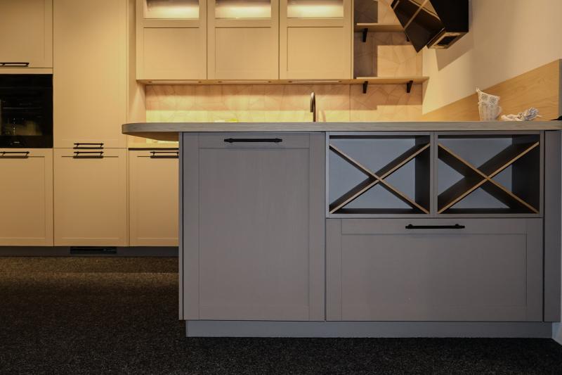 Uitgevoerd in Nobilia Frame fronten met kroonlijsten. Met o.a. afgerond houtlook werkblad, onderkast planken met wijnkruis en bovenkastdeuren met glazen frame.