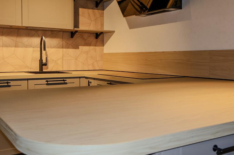 Een afgerond houtlook werkblad combineert de warme uitstraling van hout met zachte, vloeiende lijnen. De afgeronde hoeken zorgen voor een vriendelijke en elegante afwerking, terwijl de houtstructuur een natuurlijke sfeer toevoegt aan de keuken. Het werkblad is bovendien onderhoudsvriendelijk en past perfect bij zowel moderne als landelijke keukenstijlen.