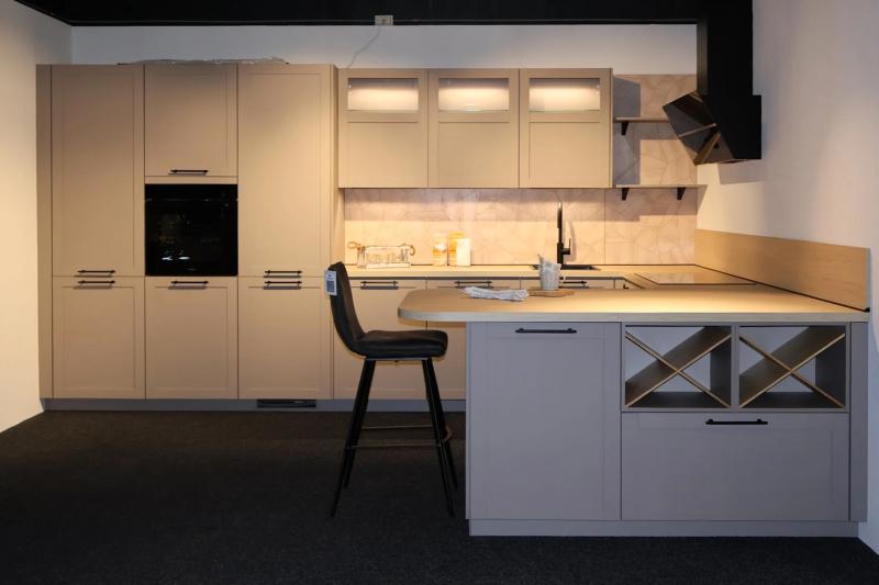 Jubileum Keukendeal 62. Compleet ontzorgde landelijke halve U-keuken uitgevoerd in een Macchiato houtstructuur, model Nobilia Frame. Inclusief inmeten, leveren en montage!