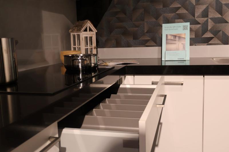 Super compleet met: luxe Siemens apparatuur: combimagnetron, brede inductiekookplaat, vaatwasser, koeler, Head-free afzuigkap, aanrechtblad, spoelbak, kraan en montagemiddelen. Ook leverbaar met gaskookplaat.