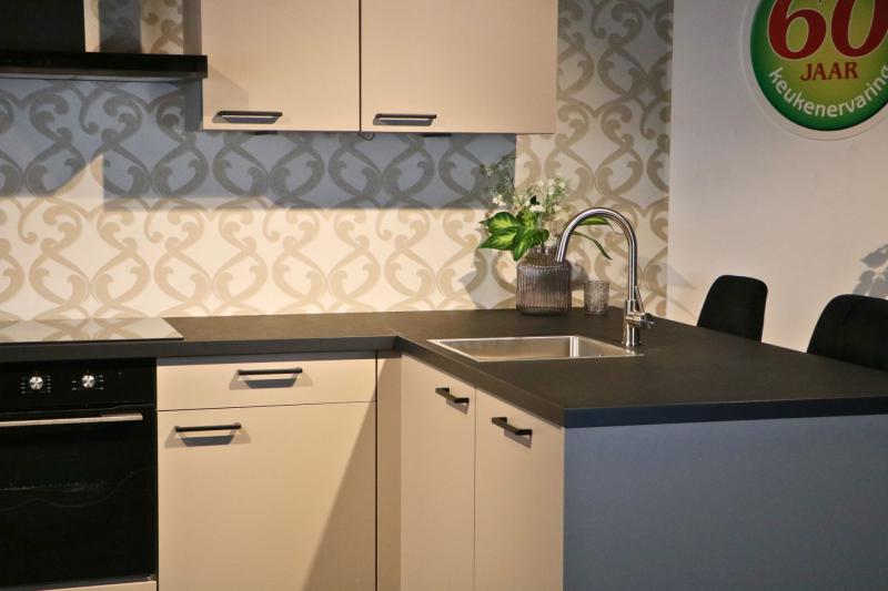 Jubileum Keukendeal 88. Compleet ontzorgde mat cindy greige hoekkeuken. Inclusief inmeten, leveren en montage!