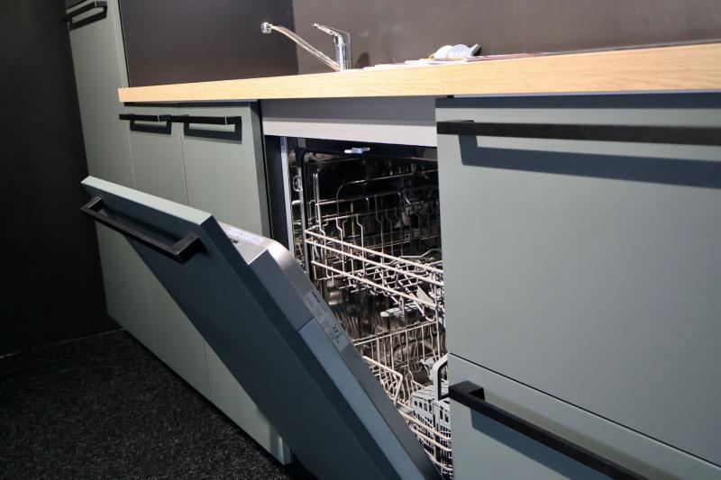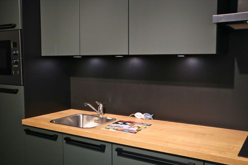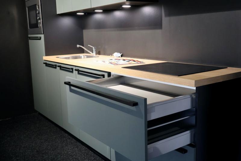 Kitchenette Nora 150. Voorgemonteerde Nobilia Easy Touch kitchenette uitgevoerd in mineraal groen. Met luxe zwarte grepen en greeploze bovenkasten.