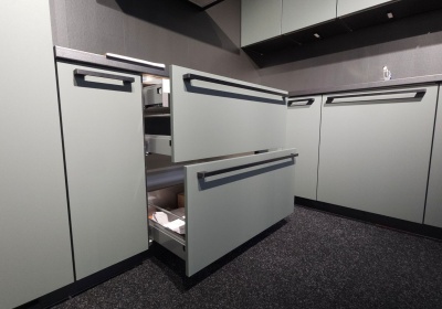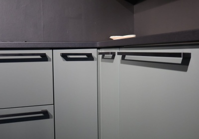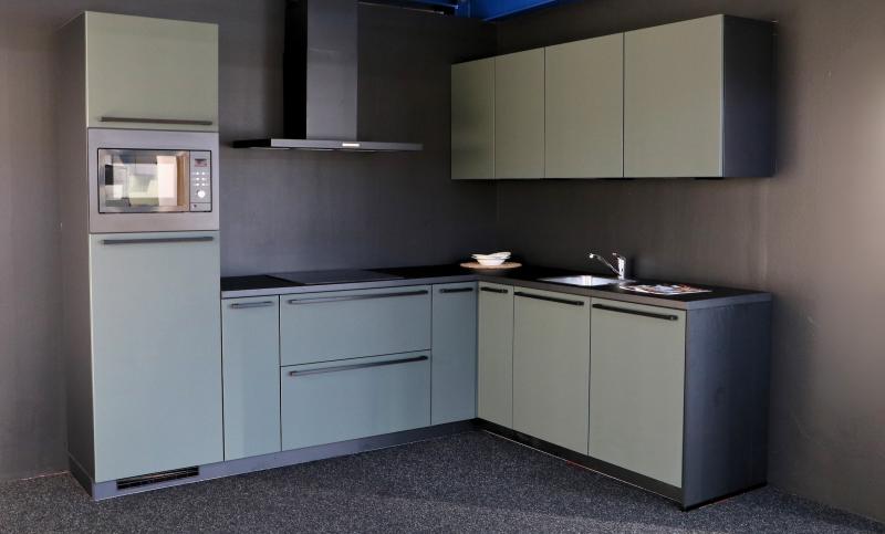 Outlet Keuken Bridget 133 is een strakke semi greeploze keuken in mineraal groen uitgevoerd, model Nobilia Easy Touch. Met luxe zwarte grepen en greeploze bovenkasten.