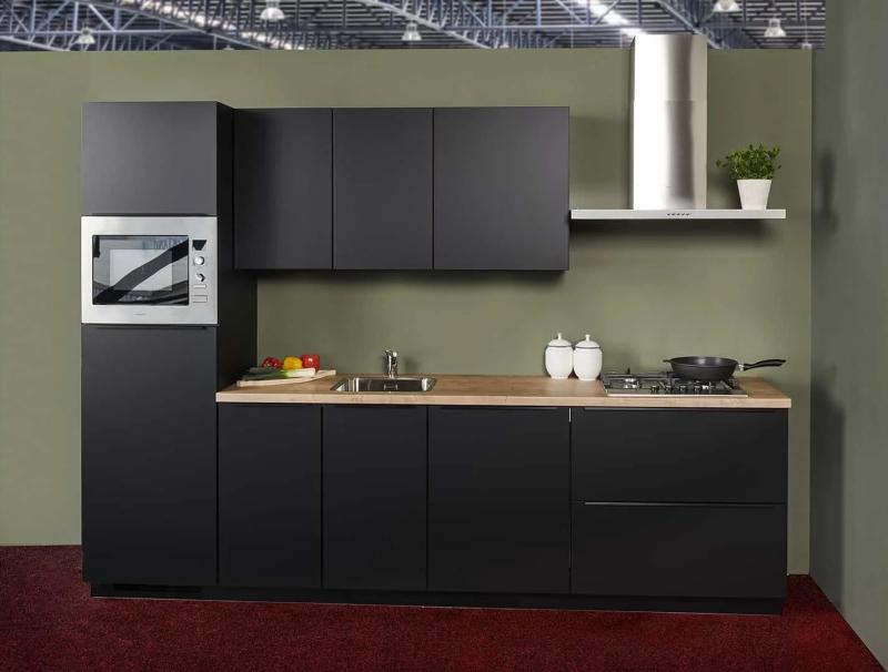 Outlet Keuken Fajah Recht 131 is een mooie mat zwarte keuken model Touch Black, deze deurfronten voelen fluweelzacht aan. Deze keuken is semi greeploos, met een extra brede ladenkast met extra binnenlade en extra hoge kasten voor extra opbergruimte. Deze topper is volledig naar eigen wens aan te passen tegen meer- of minderprijs, en is in ieder formaat direct uit voorraad leverbaar. Lengte 300 cm.