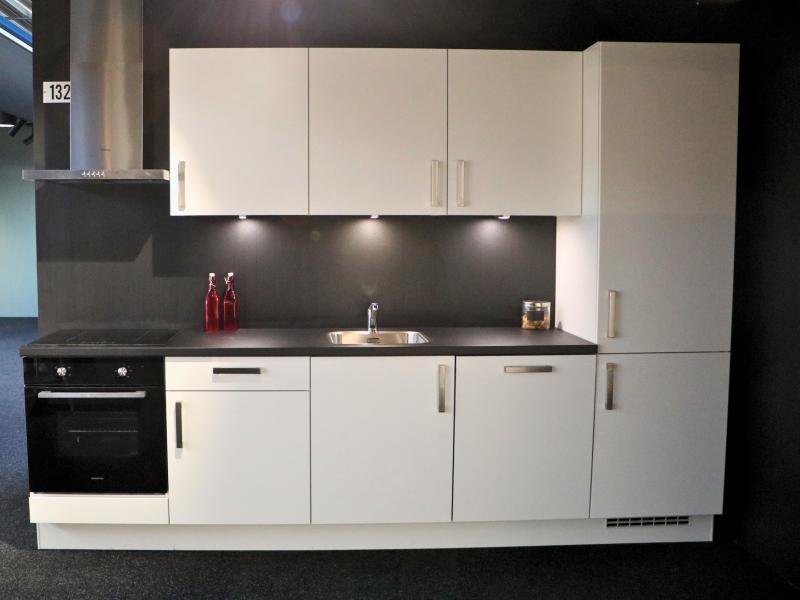 Outlet keuken Joy 132 is een slimme rechte keuken in soft-mat wit, model Laser, met robuuste RVS handgrepen. Deze keuken is in ieder gewenst formaat direct uit voorraad leverbaar. Lengte 300 cm.