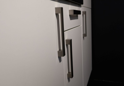 Outlet Keuken Julia 137 is een voorgemonteerde Nobilia Laser rechte keuken in soft-mat witte uitvoering, met robuuste metalen handgrepen.