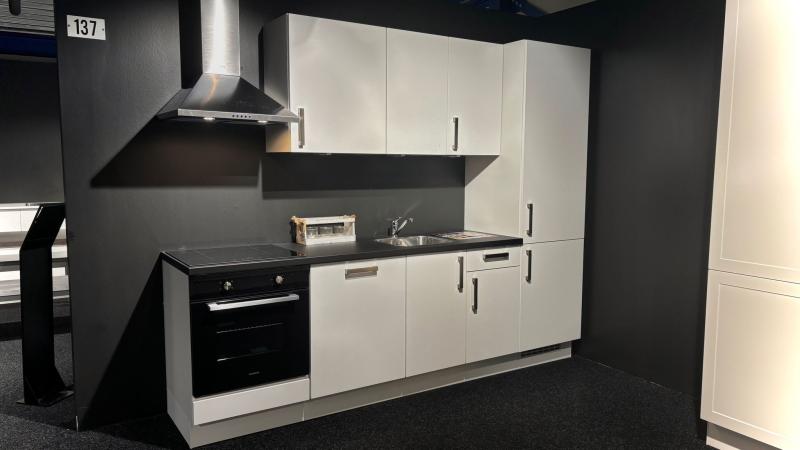 Outlet Keuken Julia 137 is een voorgemonteerde Nobilia Laser rechte keuken in soft-mat witte uitvoering, met robuuste metalen handgrepen.