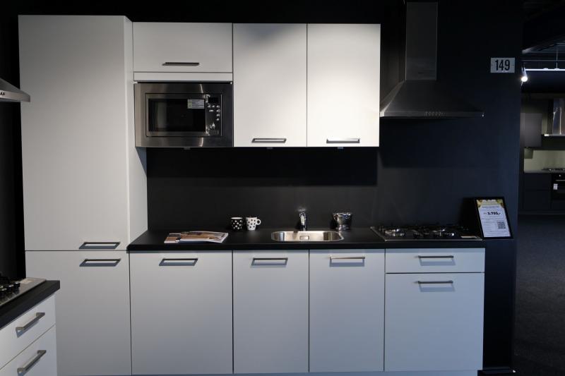 Superhandige rechte keuken in het soft touch mat wit, model ECO Florenz, deze deuren voelen fluweelzacht aan! Deze keuken is in ieder gewenst formaat direct uit voorraad leverbaar. Model Kendra is voorzien van een besteklade, en ruime keukenkasten voor veel opbergruimte. 270 cm lang.