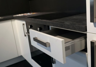 Deze keuken is supercompleet met apparatuur, inclusief 5 jaar garantie: Oven, inductiekookplaat, vaatwasser, schouw, koelkast/vriezer, aanrechtblad, spoelbak, kraan en montagemiddelen.