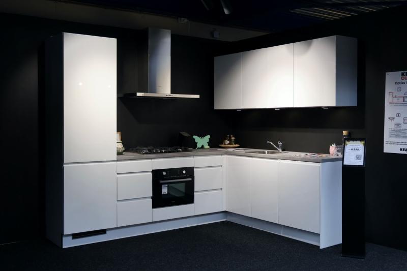 Super compleet met apparatuur: combi magnetronoven, gaskookplaat, vaatwasser, koelkast/vriezer, brede blokschouw, aanrechtblad, spoelbak, kraan en montagemiddelen.