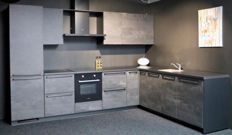 Outlet Keuken Yvon 145 is een voorgemonteerde Nobilia Laser Beton zwarte hoekkeuken. Met luxe zwarte stanggrepen en greeploze bovenkasten.