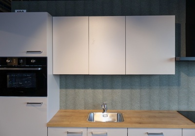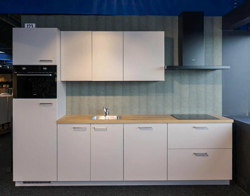 Super compleet met: oven, inductiekookplaat, vaatwasser, Koeler, afzuigkap, aanrechtblad, spoelbak, kraan en montagemiddelen.