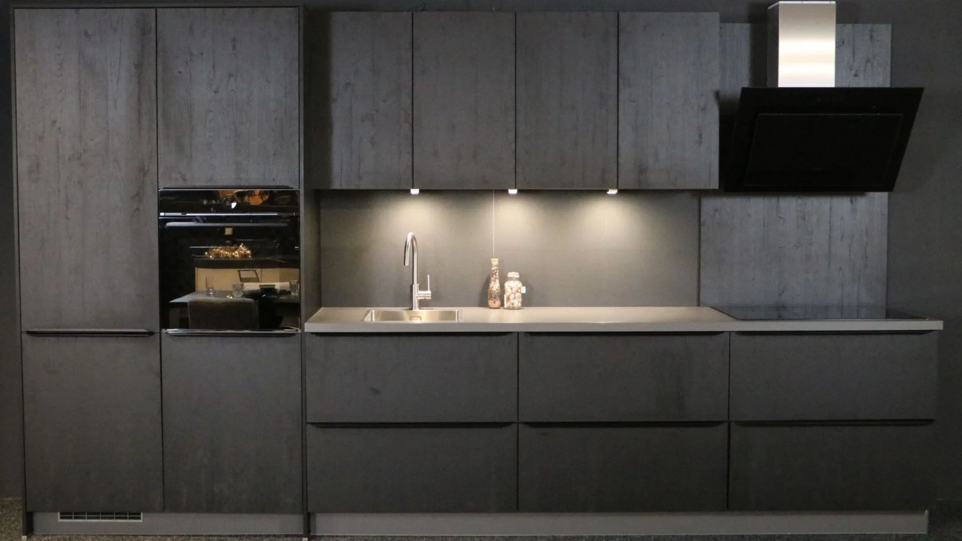 Zwarte houtnerf rechte keuken met o.a. LED-verlichting onder de vouwklepkasten, luxe ladekasten met binnenlade en zwarte greeplijsten.