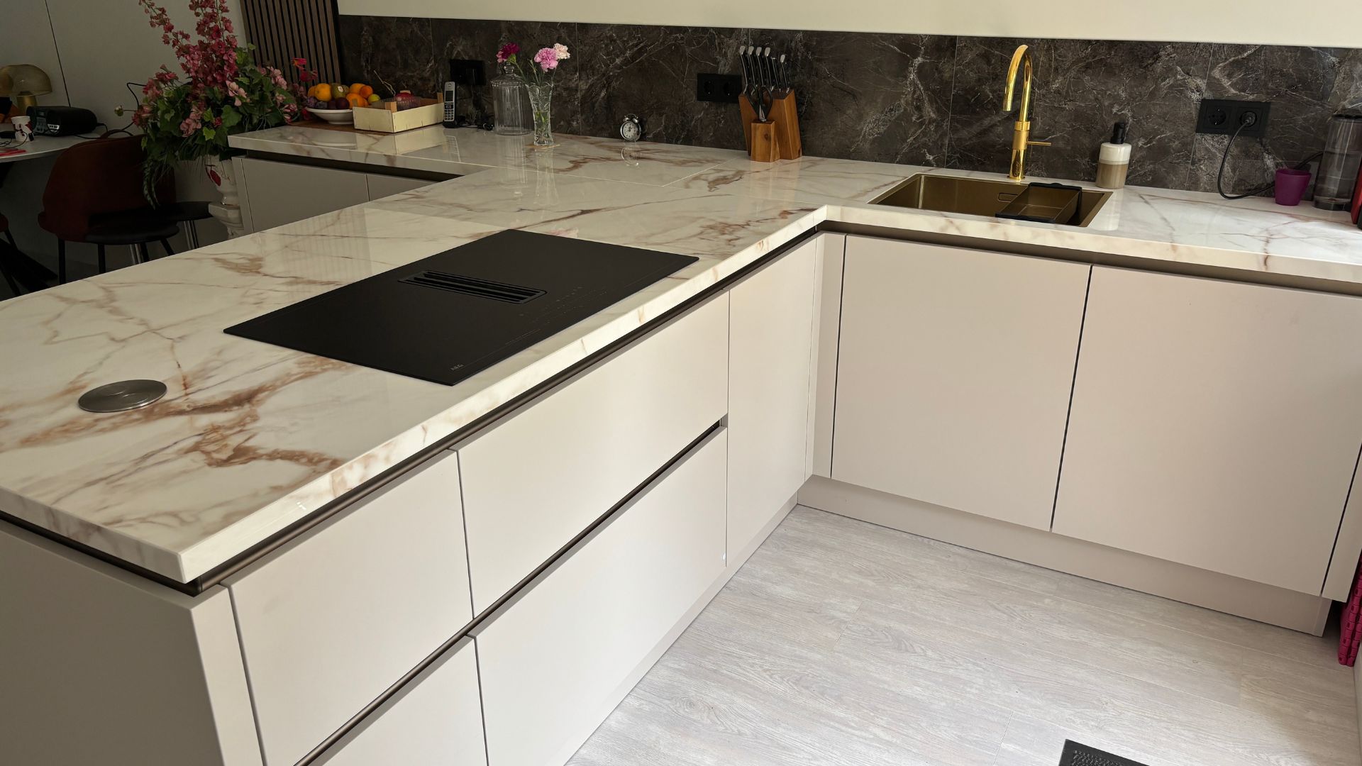 Combineer de T-keuken met natuurlijke materialen zoals hout, steen of betonlook om warmte en diepte te creëren. Wil je een moderne uitstraling? Dan is een T-keuken in matzwart, wit of greige een uitstekende keuze.