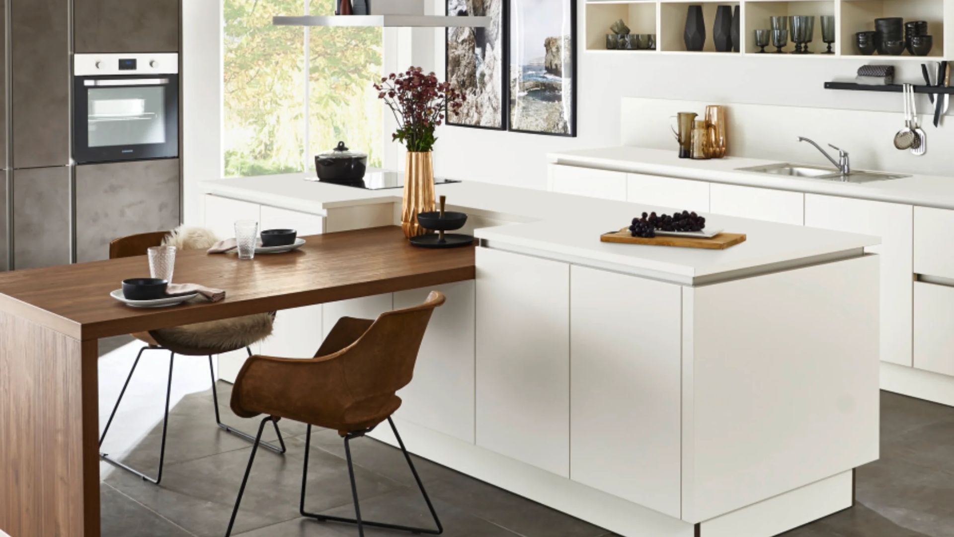 Door de karakteristieke T-vorm creëer je extra bladruimte en een natuurlijk kookeiland dat ook dienst doet als bar of eetplek. Het zorgt voor een open indeling die perfect past in moderne woningen en open woonruimtes.