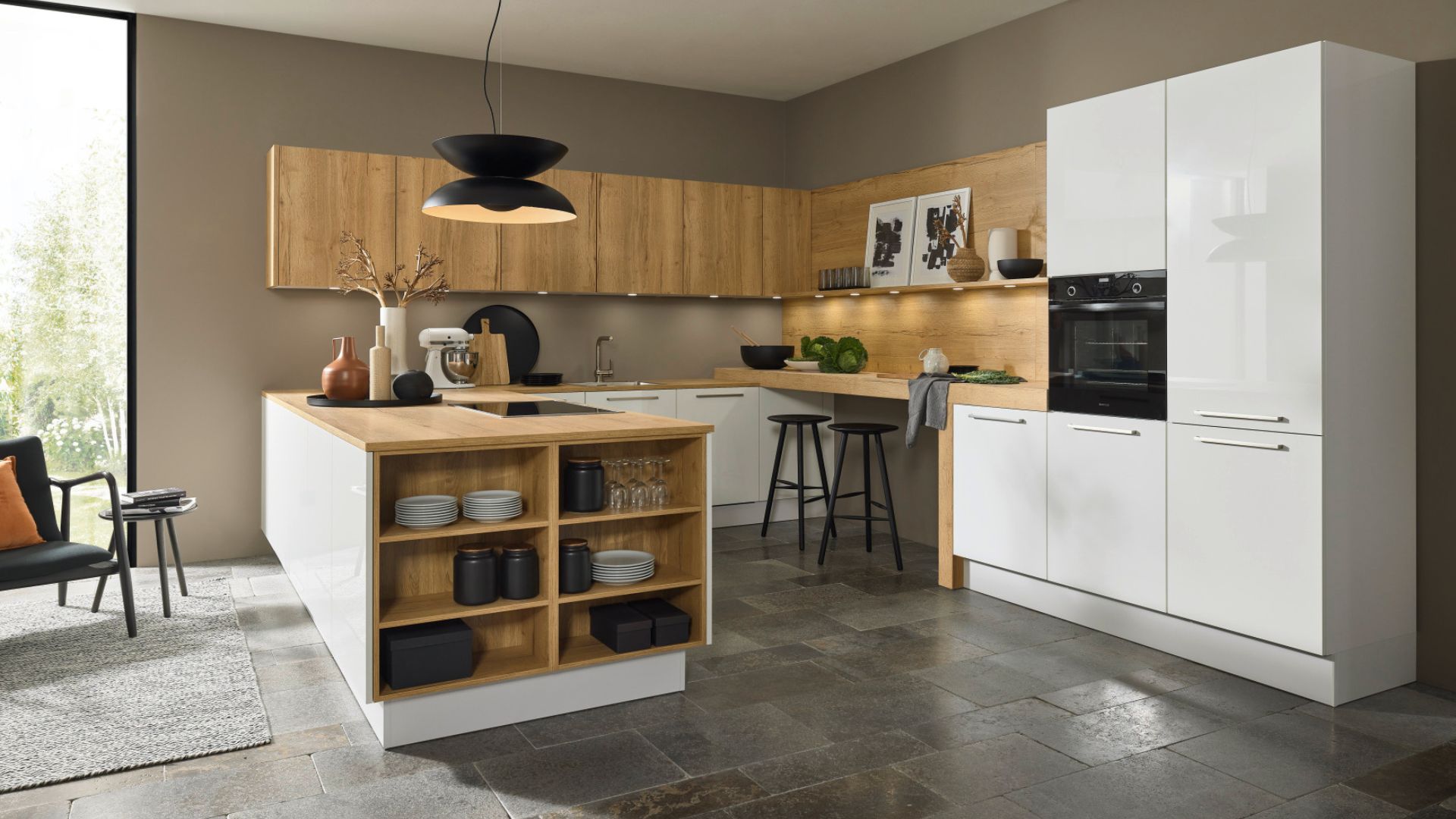 Een U-keuken met bar maakt van je keuken een centrale leefplek. Laat één zijde van de U iets doorlopen en plaats er barkrukken bij voor gezelligheid en verbinding.