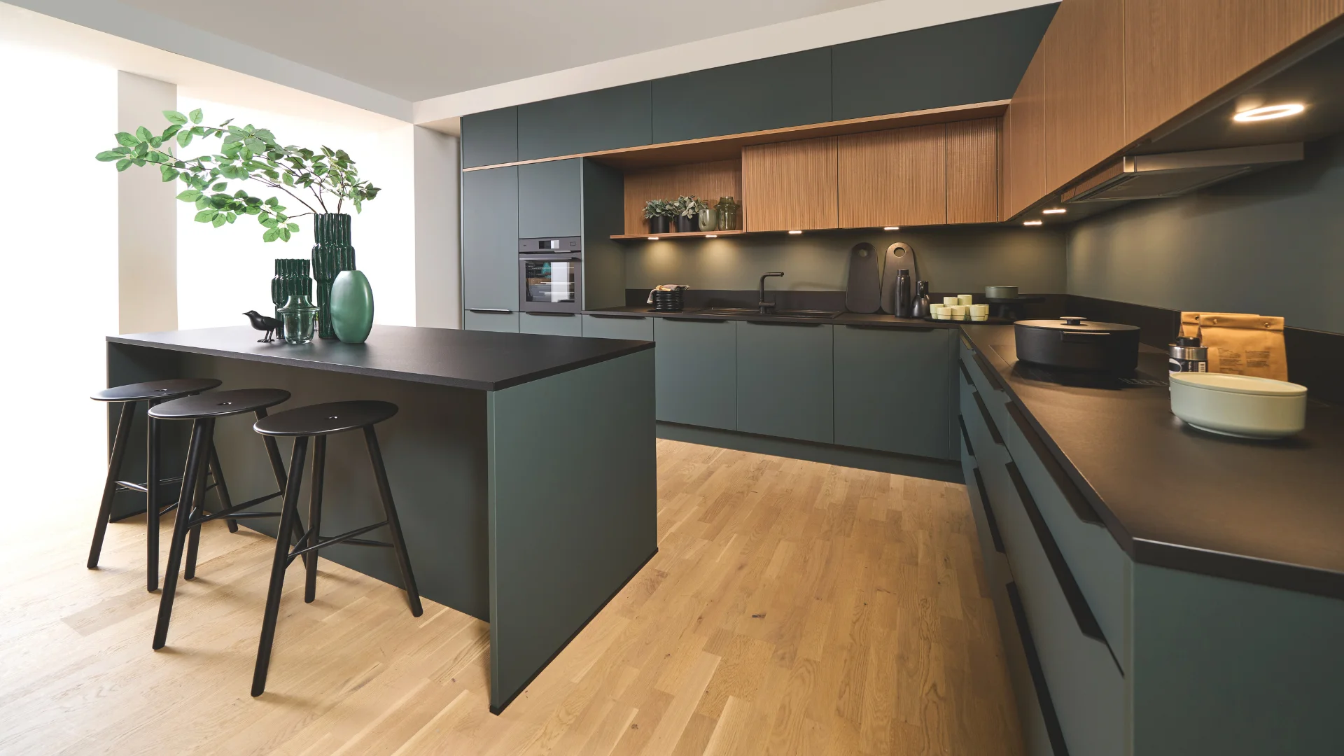 Denk aan fronten van echt fineer, werkbladen van natuursteen of keramiek met exclusieve structuren, volledig geïntegreerde apparatuur en designverlichting die het geheel naar een hoger niveau tilt. Alles is maatwerk, afgestemd op jouw ruimte en manier van leven.
